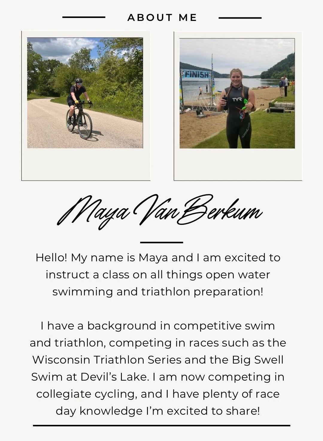 The Triathlon Prep class will be taught by local triathlete, Maya VanBerkum! Learn more about Maya below!